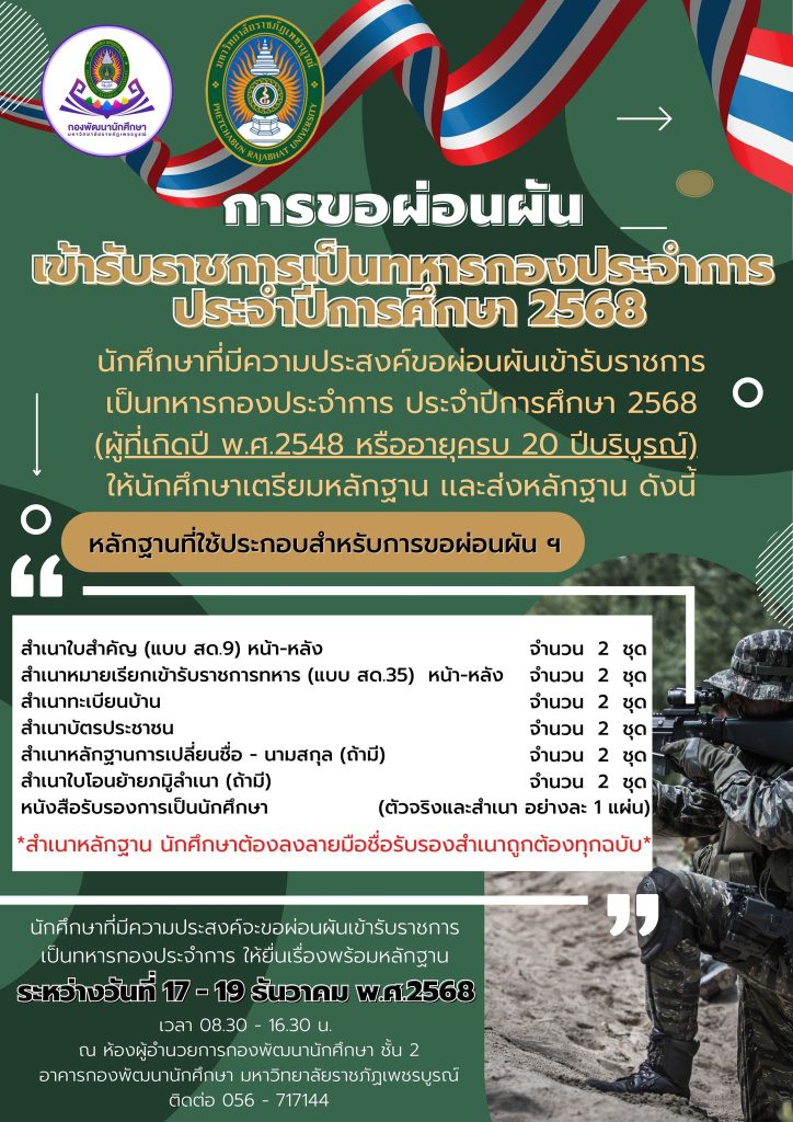 แจ้งนักศึกษาที่จะยื่นขอผ่อนผันทหาร ประจำปีการศึกษา 2568